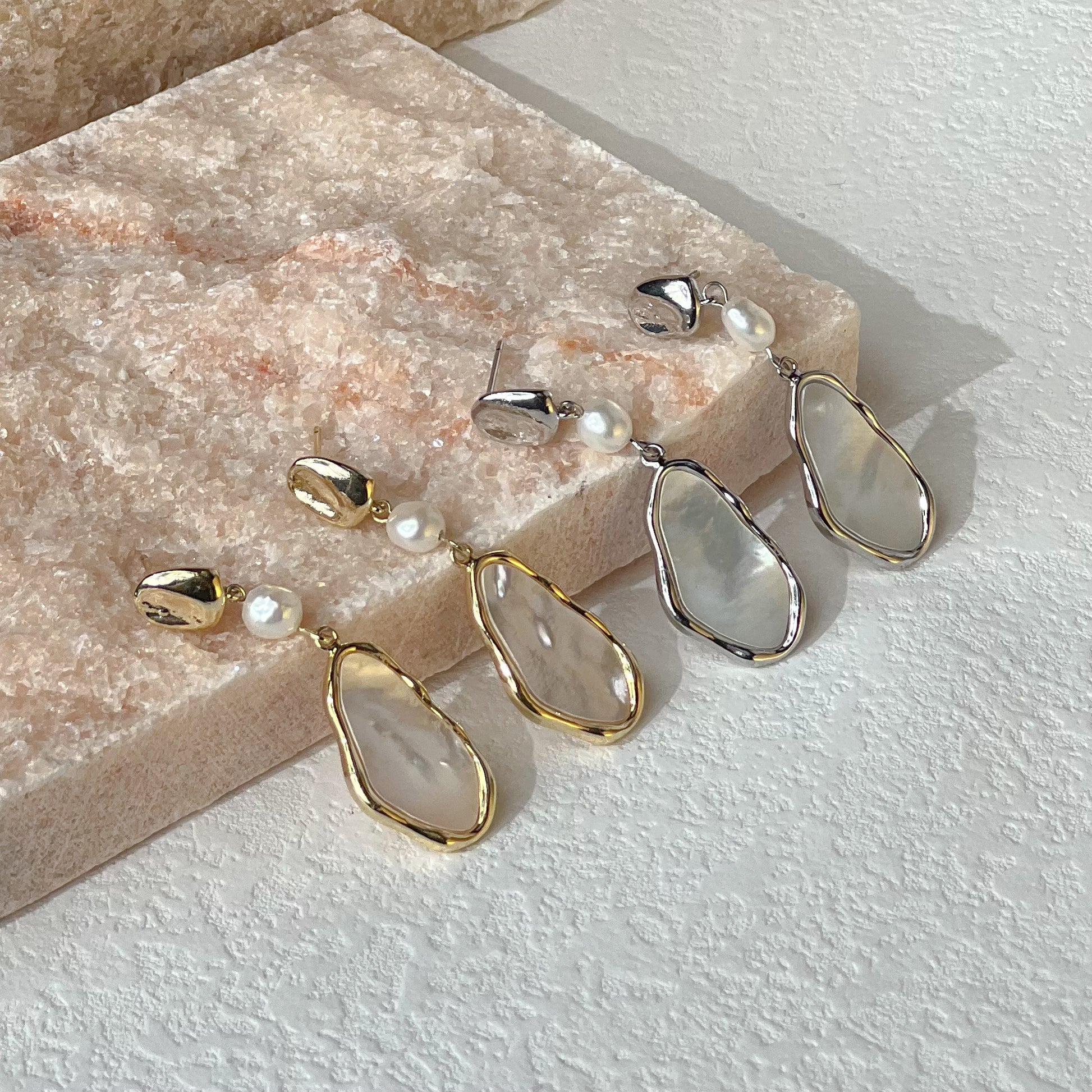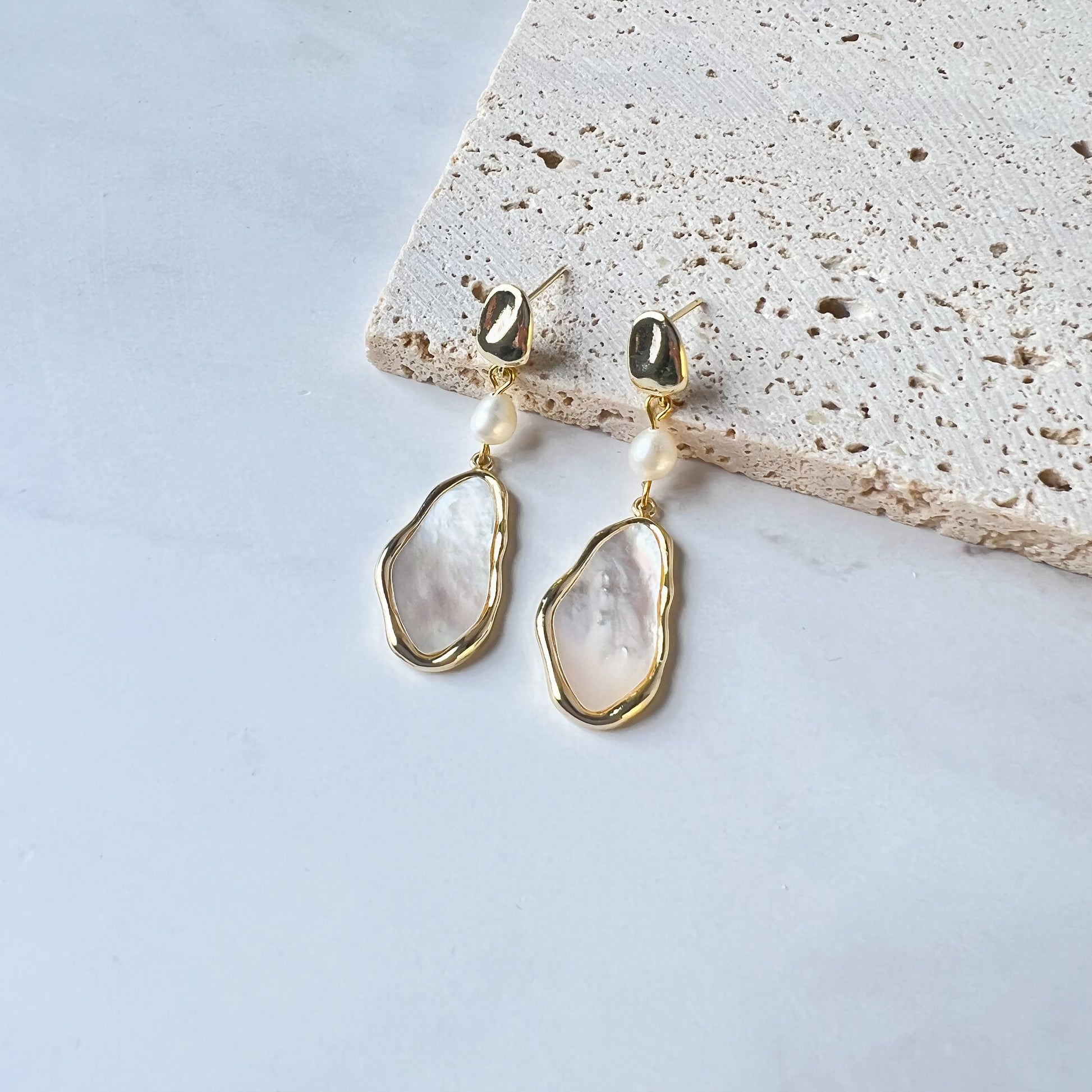 14K GOLD-PLATED EARRINGS WITH MOTHER-OF PEARL PENDANT 淡水珍珠貝殼片吊墜耳環