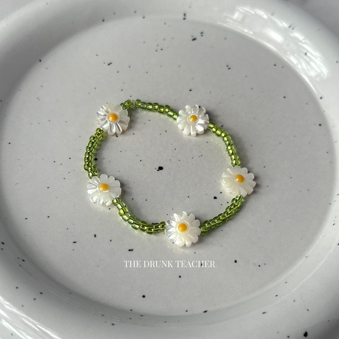 Our flower bracelet is the perfect accessory to show off your fun and flirty side. Made with mother-of-pearl flowers and green beads, this bracelet is elastic so it will fit comfortably on your wrist. Whether you're hitting the beach or strolling on the street, our flower bracelet is sure to add a touch of whimsy to your look!