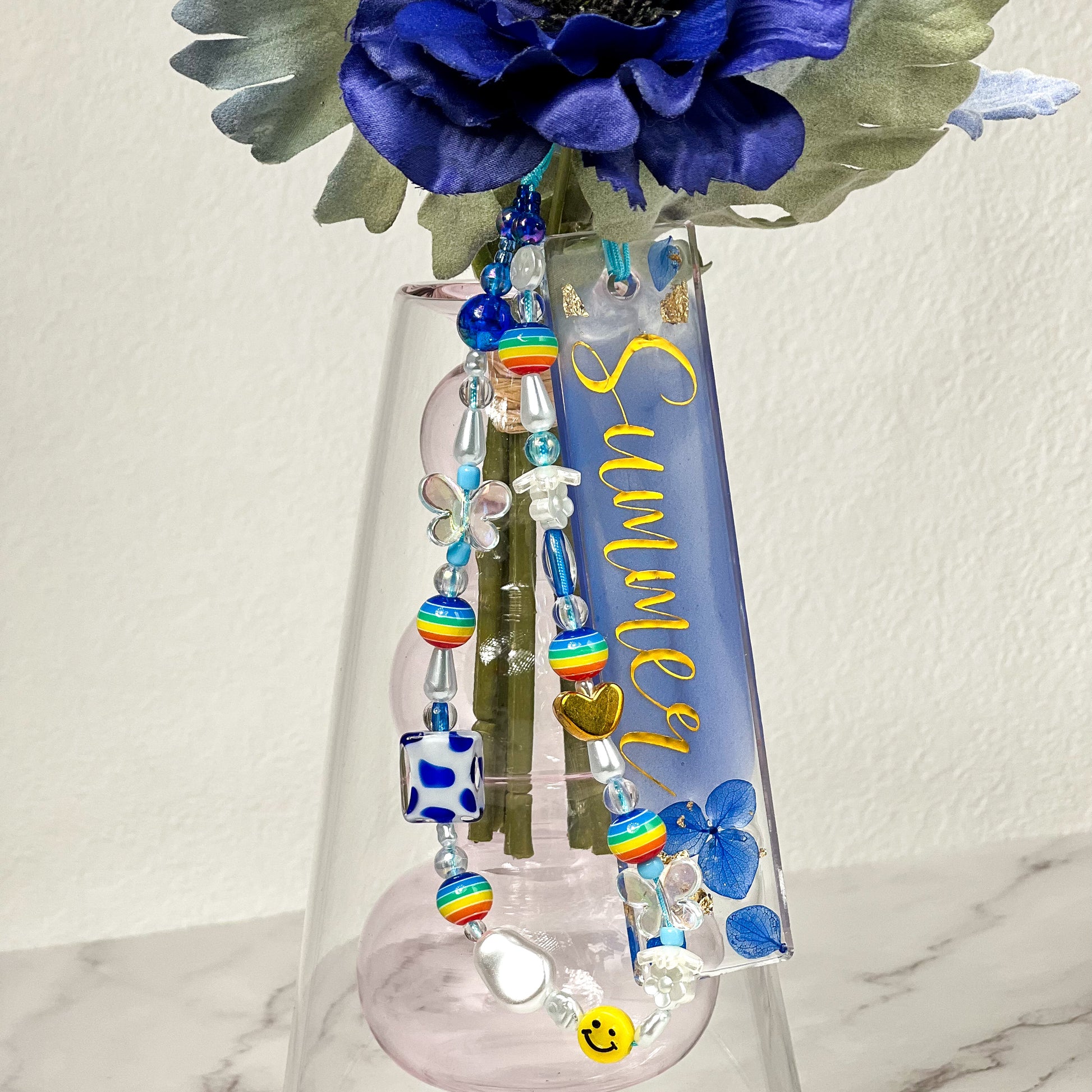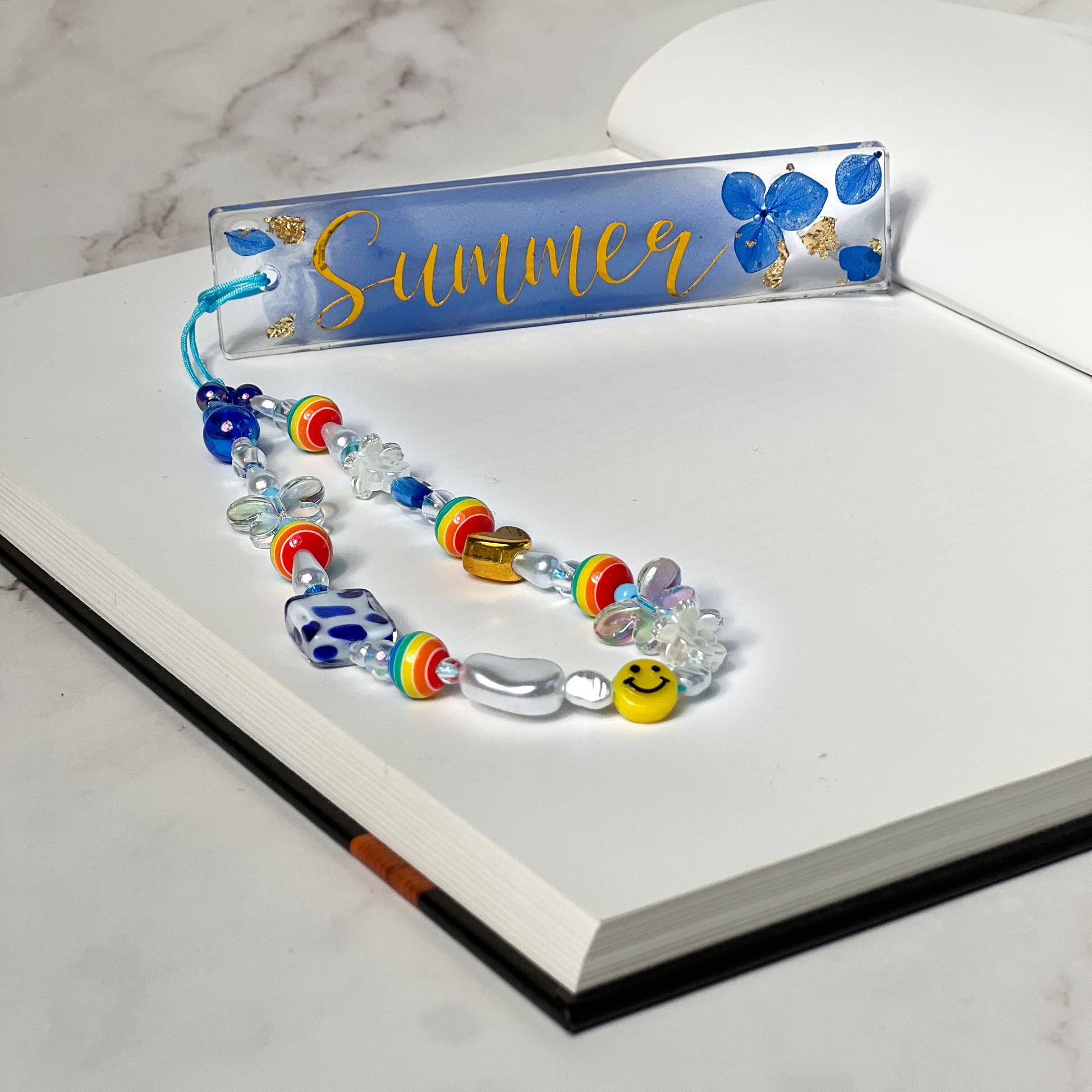 With sparkles and gold/silver flakes, this bookmark is sure to stand out from the rest. And if that's not enough, why not jazz it up with a handmade strap? Each one is unique and colourful, adding personality to your reading time. So grab one today and start reading like a pro!